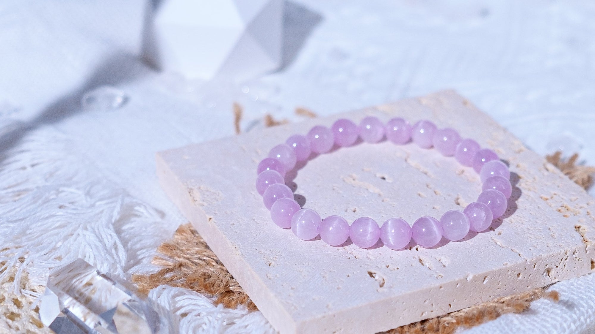 |Lithium Bracelet| Gentle pink-purple, translucent crystals, with a charming cat's eye under the light. |Lithium-Kunzite| Lithium, known as the Queen of Crystals, helps the wearer get...