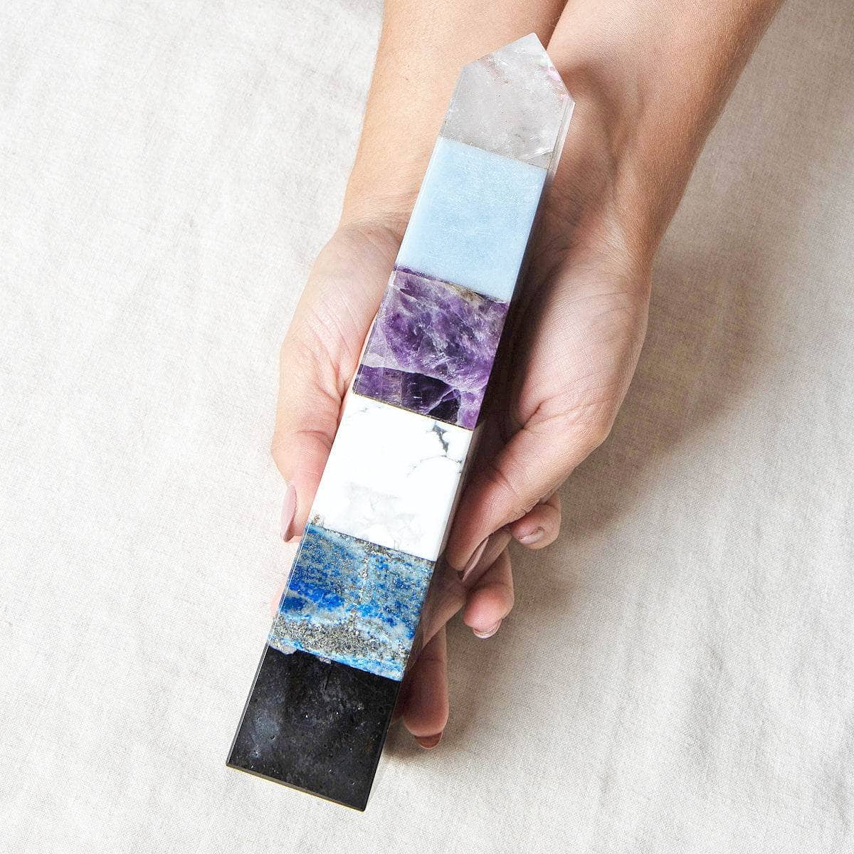 Get stacked with serenity and bliss out with the serene and stress-free crystal tower. This serenity tower calls on the healing light of some of our favorite high vibration crystals. Clear Quartz, Angelite, Amethyst, Howlite, Lapis Lazuli, and Black Tourmaline all come together to cleanse the chakras of stagnant energy, bring peace and harmony to the mind, and lift you up in a thousand splendid ways so you can shine.